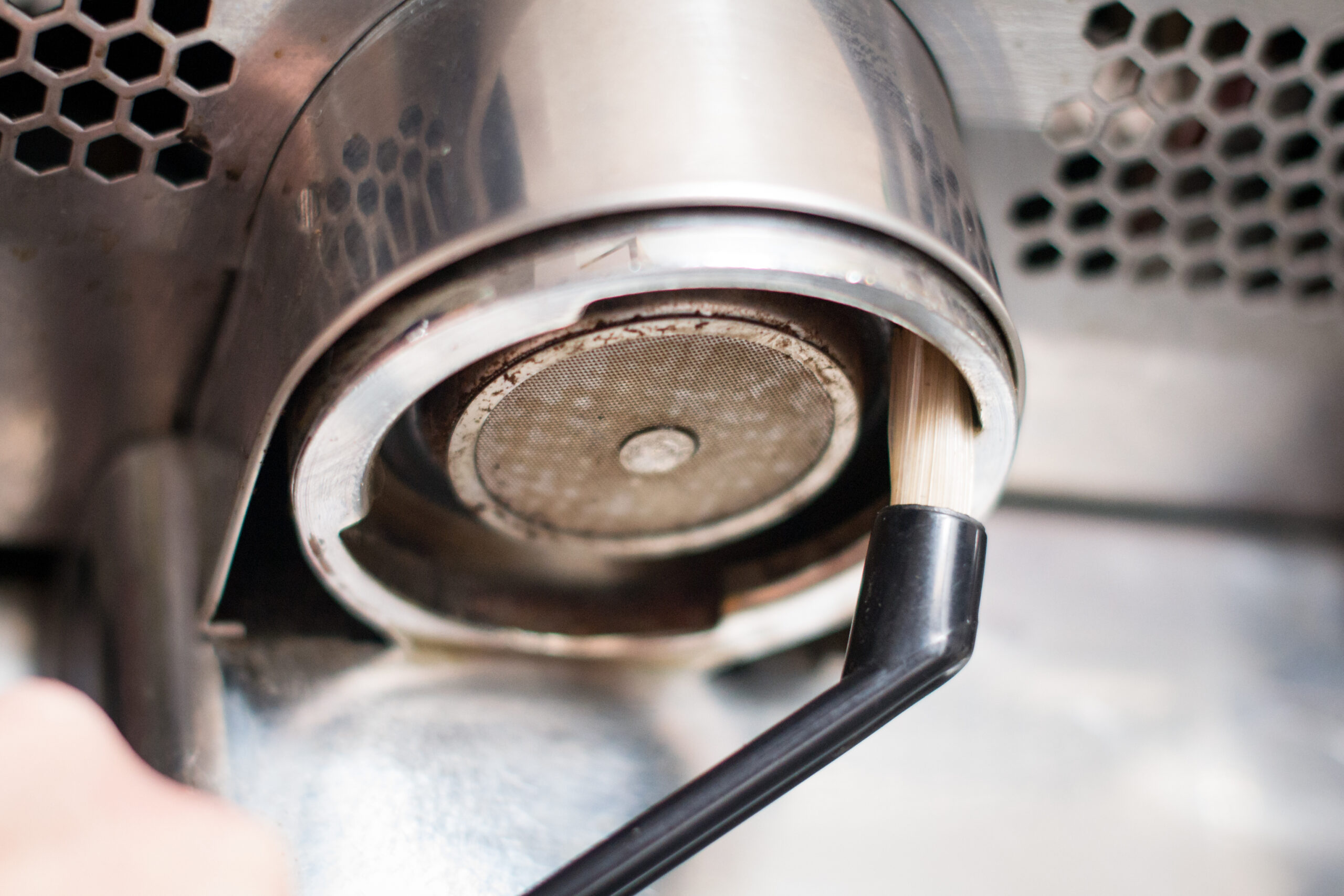 Remove the basket from the portafilter by using a teaspoon. Then using a toothbrush, scrub both the basket and interior of the portafilter well. Using hot water will make it a lot easier to clean, but be careful not to burn yourself.