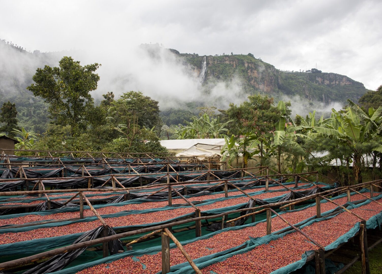 During this time, the fruit starts to break down, infusing the beans with flavours from both the cherries and oranges. Once complete, the beans are removed from the cherries, washed, and then spread across large, raised beds to sun-dry.