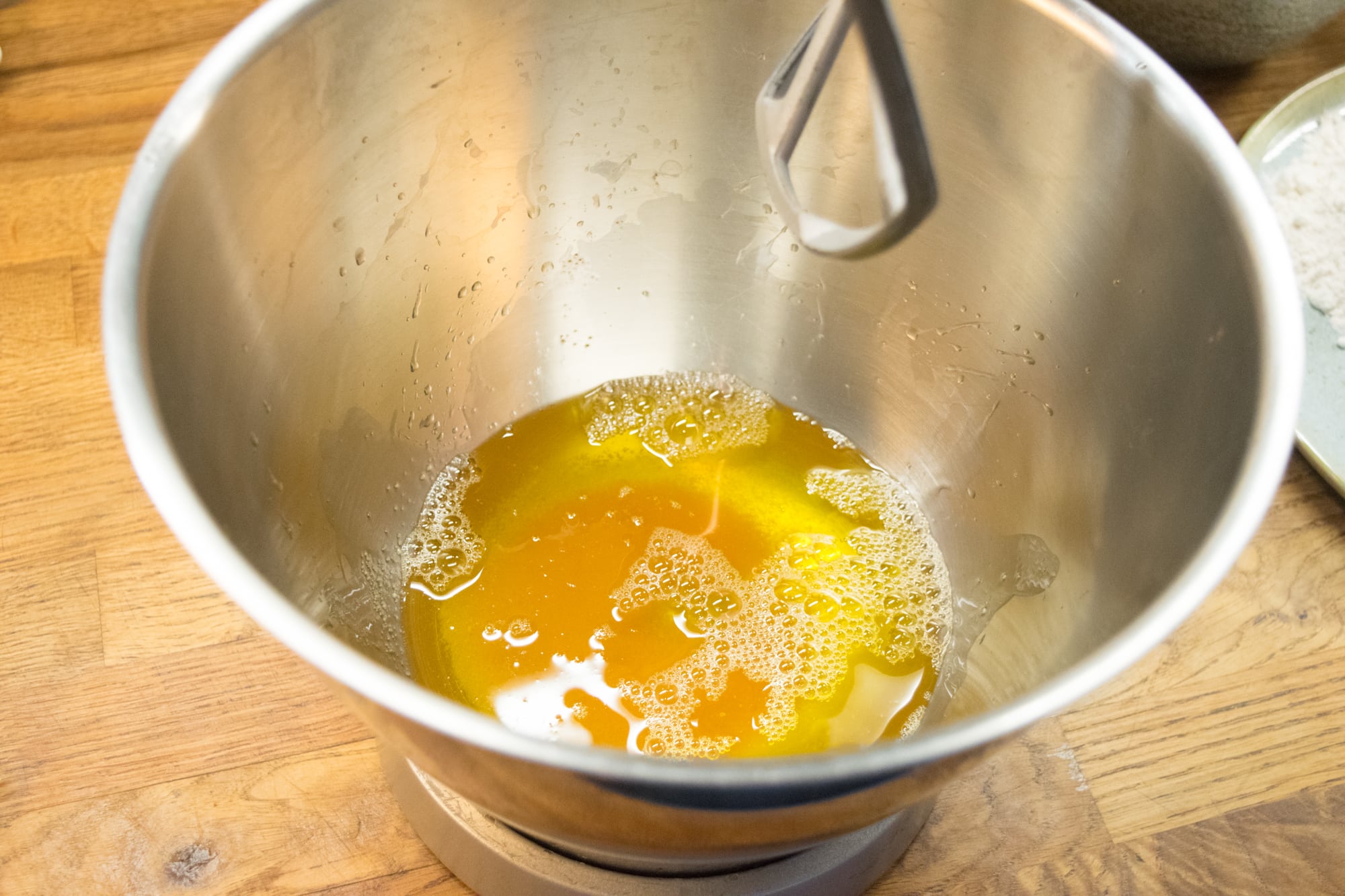 When the butter is browned, pour it into a heatproof bowl and leave it to cool. As it cools,it will continue to brown off. Add it to your mixing bowl.