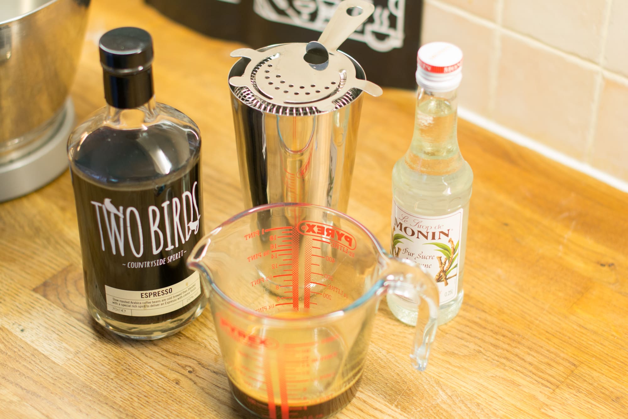 Pour the espressos, espresso liqueur and sugar syrup into a cocktail shaker.