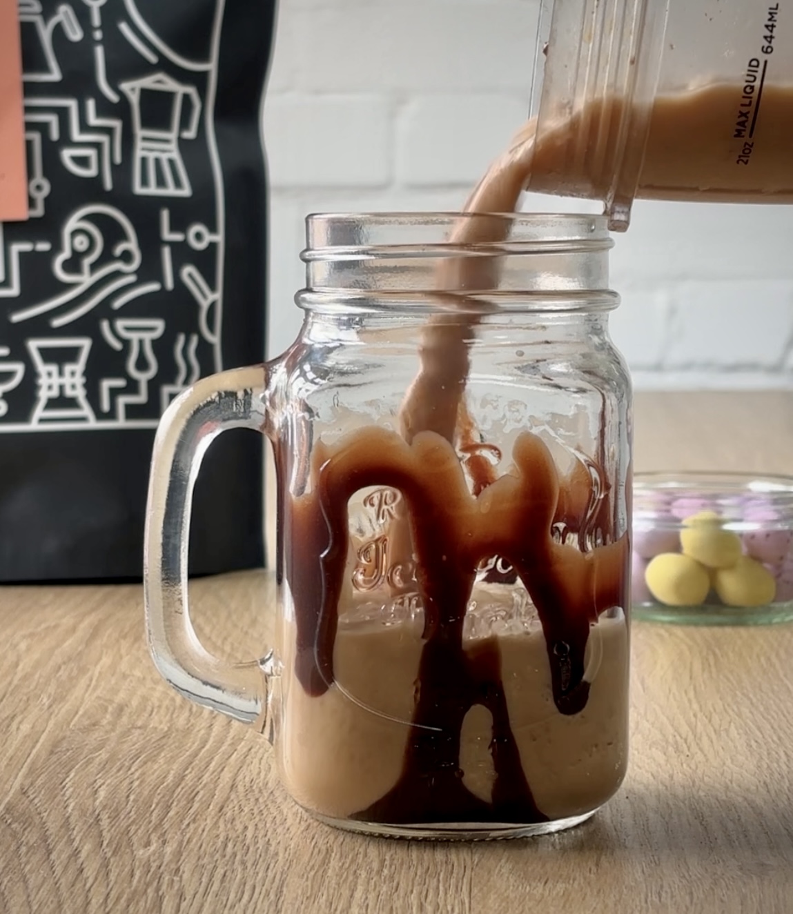 3. Once your hot chocolate and espresso are cooled to at least room temperature, add them with ice and mini eggs to your blender.