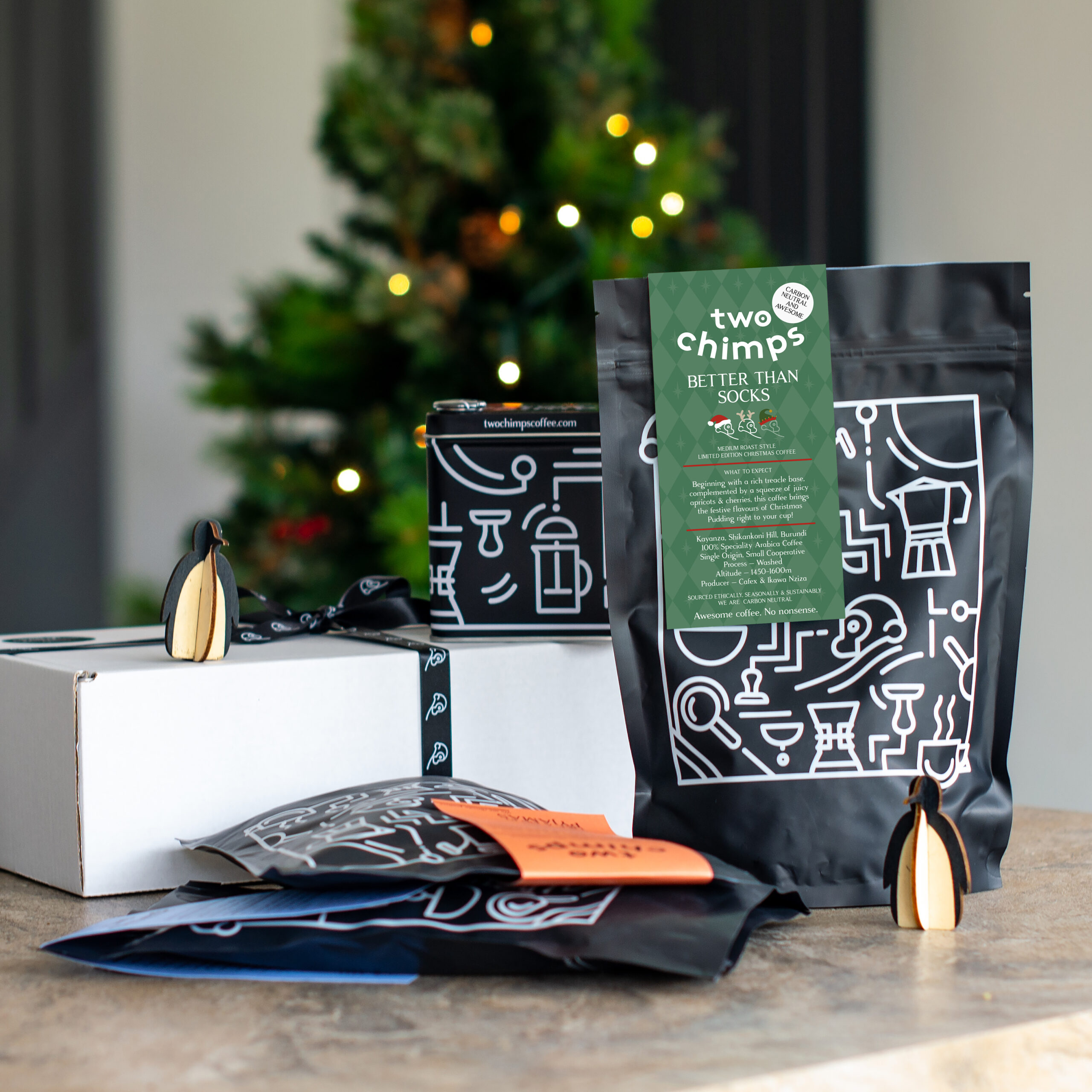 But that’s not all! You have two exciting gift options to choose from. The first is our Christmas Coffee & Cake Gift Box, which includes a 250g bag of our limited-edition Better than Socks Christmas Coffee. The second option lets you pick two 125g sample bags of coffee for them to savour.