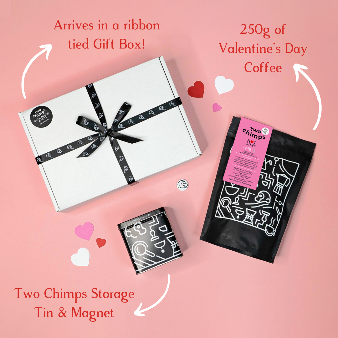 Take our Valentine’s Coffee to the next level with our delightful Valentine’s Coffee Gift Set! Inside, your special someone will find a 250g bag of our Hot Stuff (ground or whole bean!), a Two Chimps Storage Tin and a Magnet.