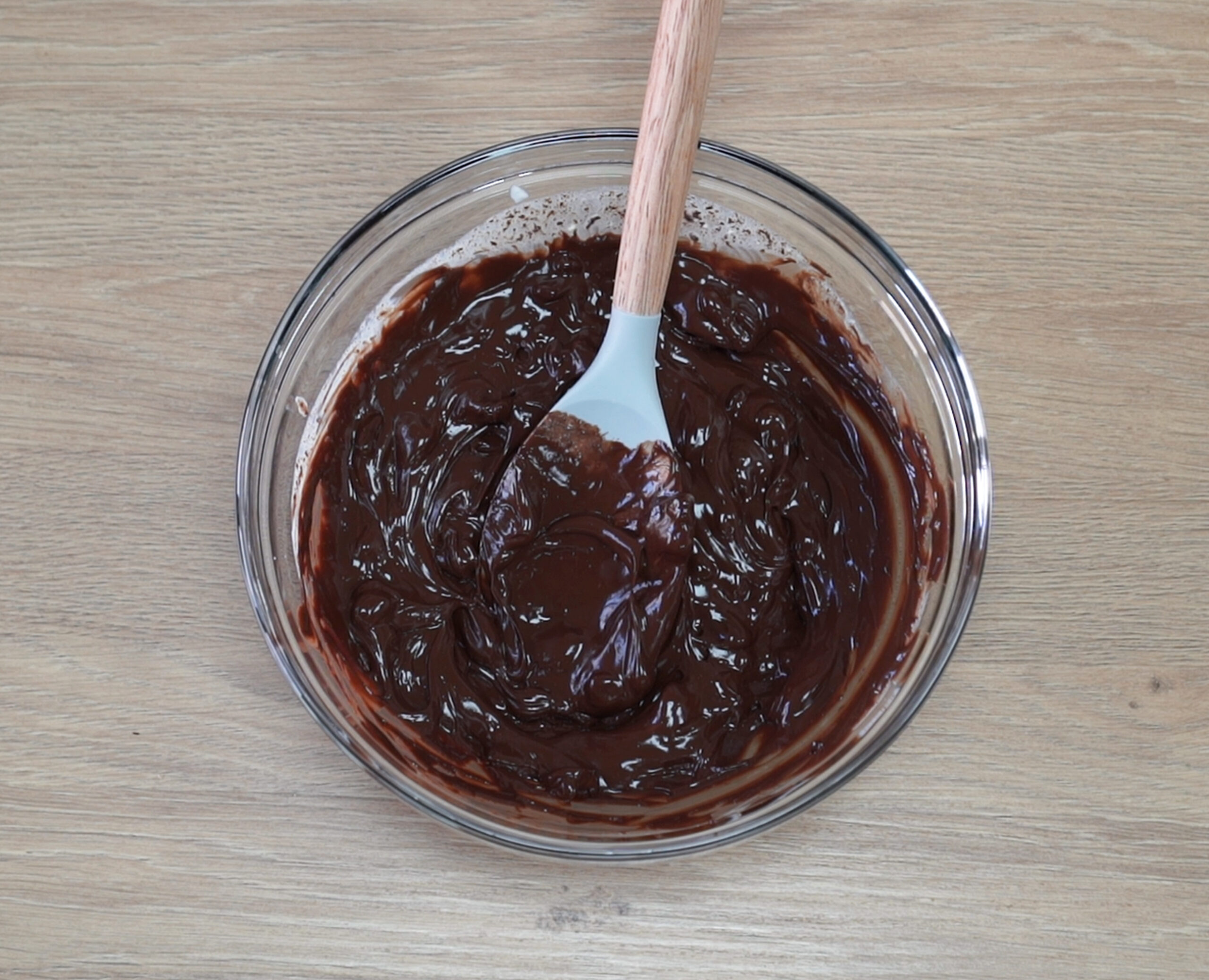 3. Pour over the chocolate and wait 1 minute until you start stirring. Keep stirring until you have a smooth and glossy texture.