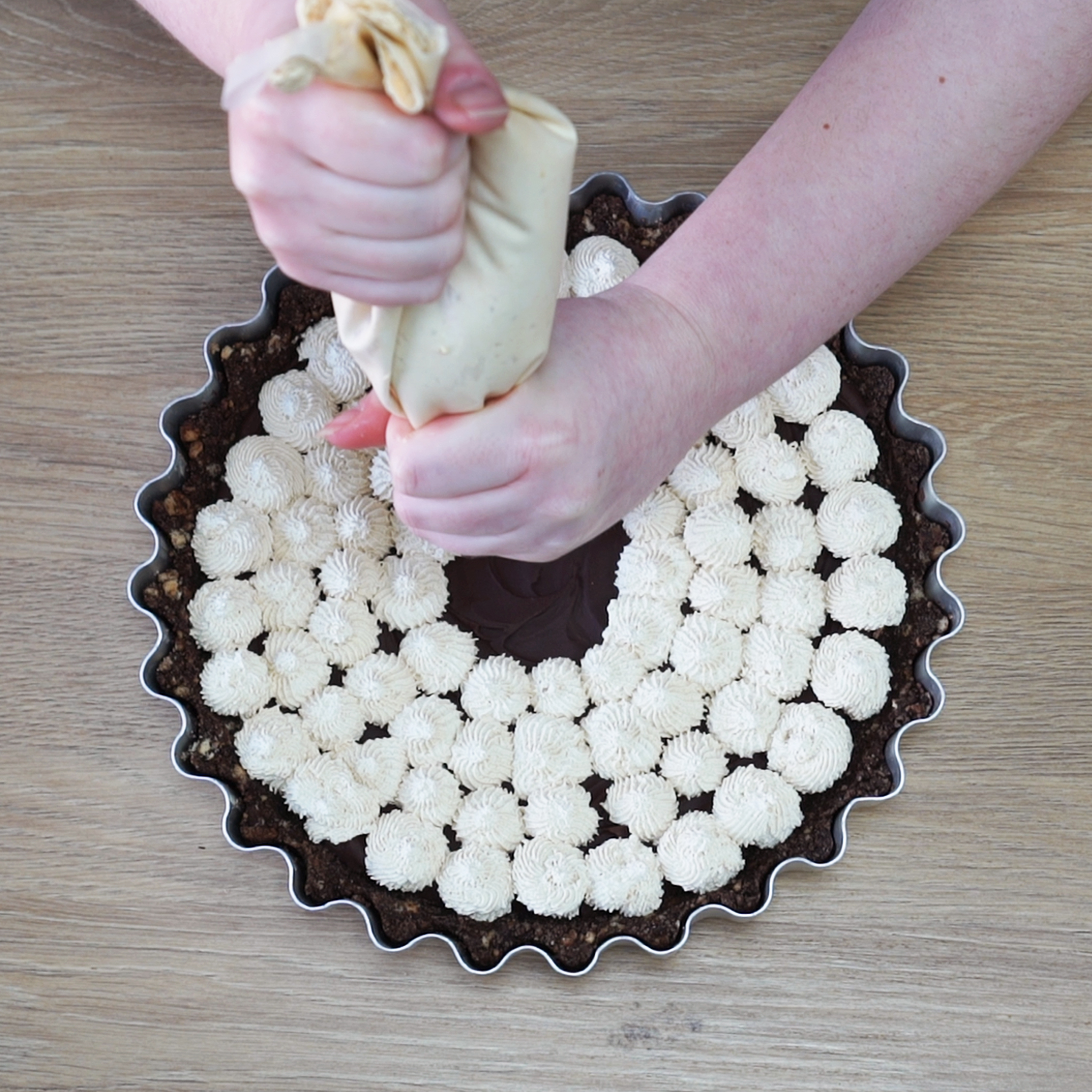 5. Take your tart and the coffee cream, and either spread or pipe the cream on top.