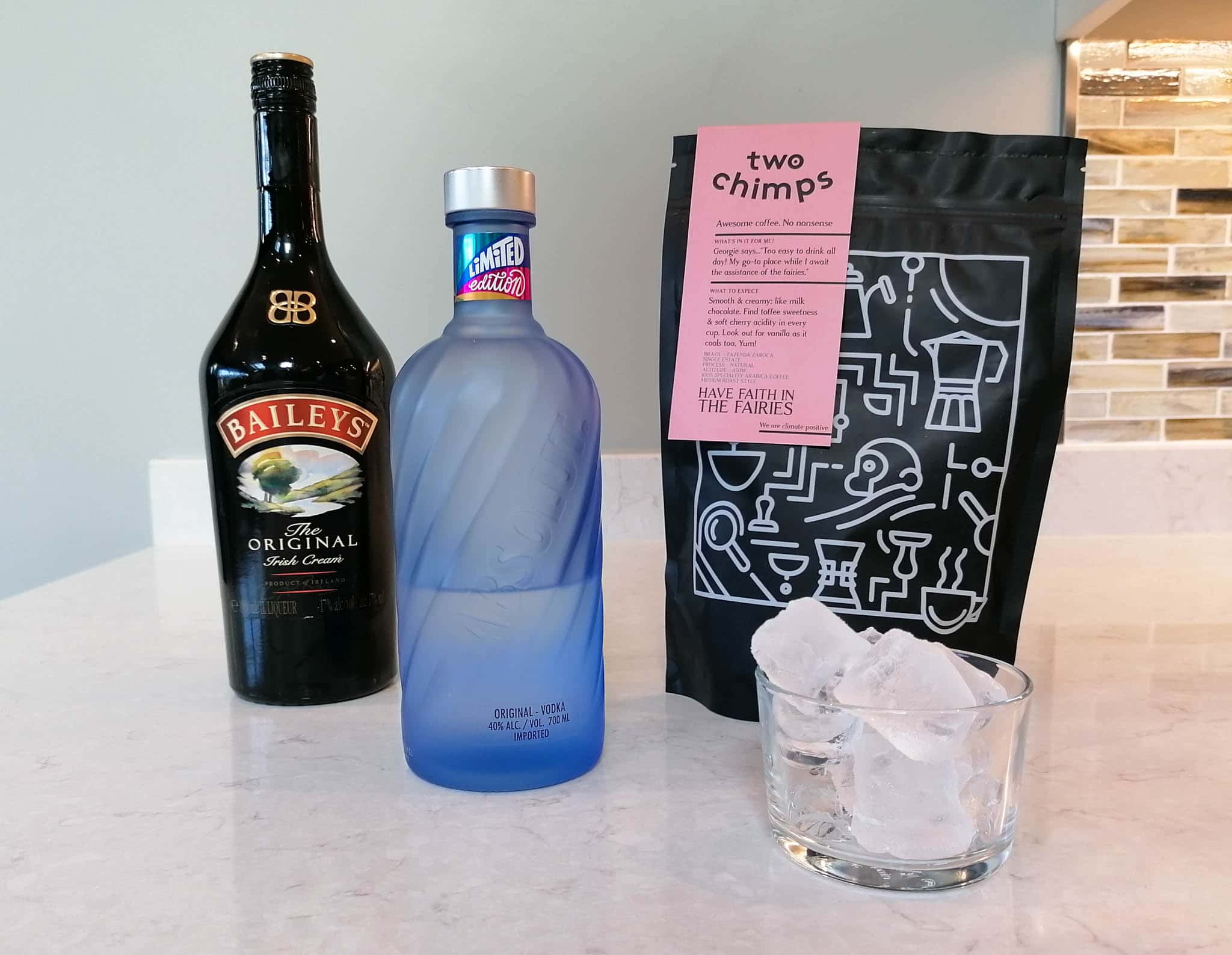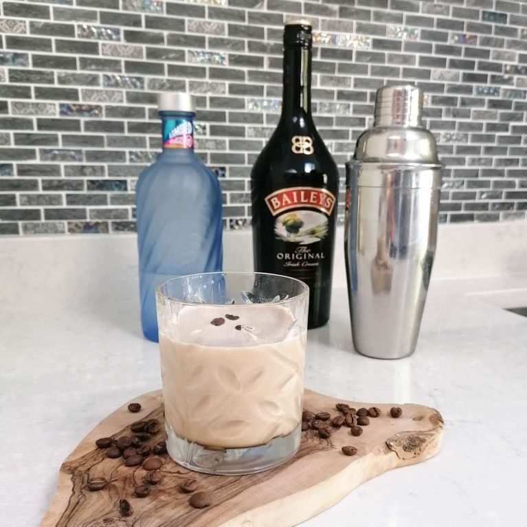 1. Place the Baileys, vodka, coffee and ice cubes into a cocktail shaker (or homemade alternative!).
