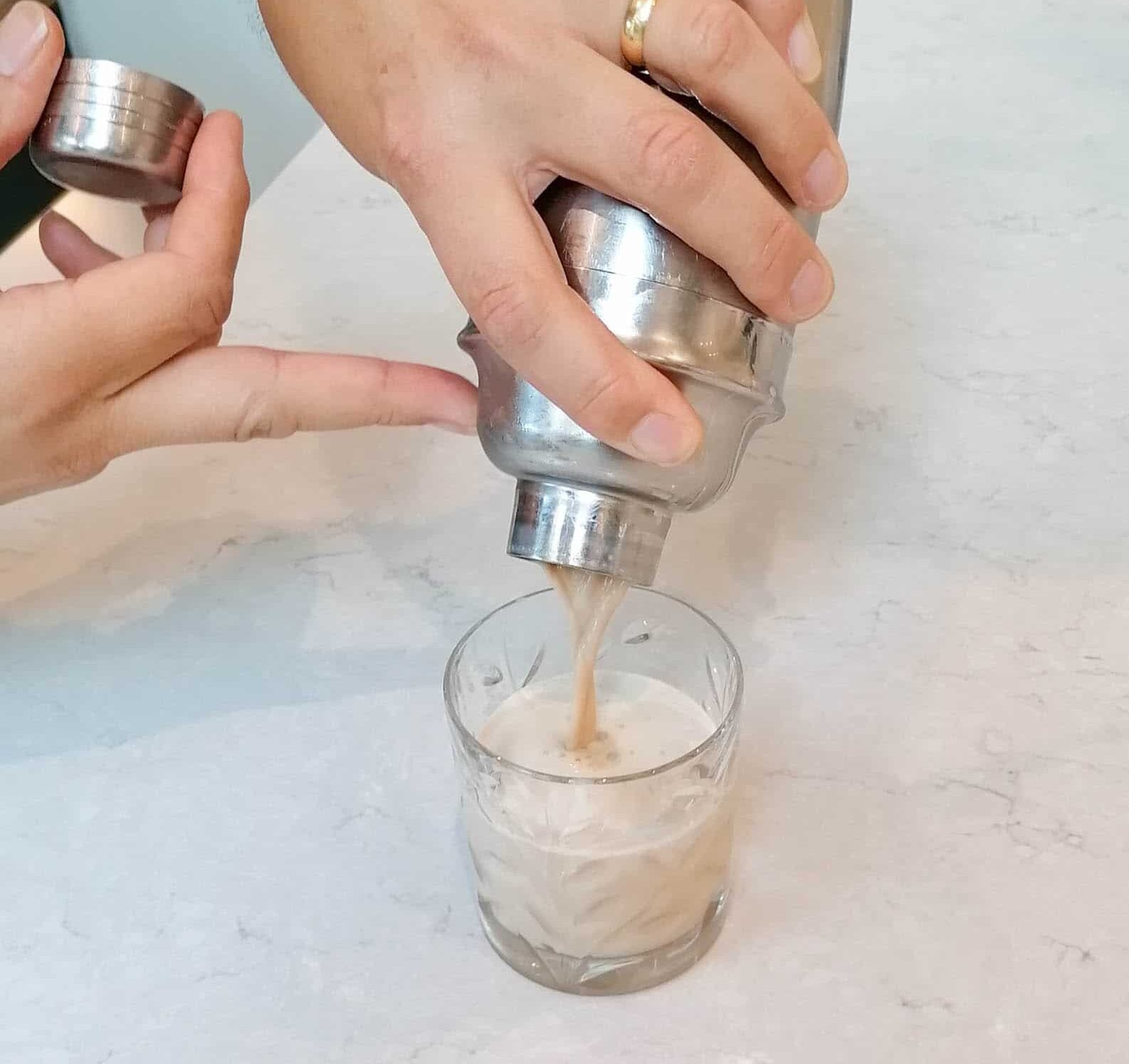 2. Shake until the outside of the cocktail shaker feels cold and the liquid is a smooth, tan colour.