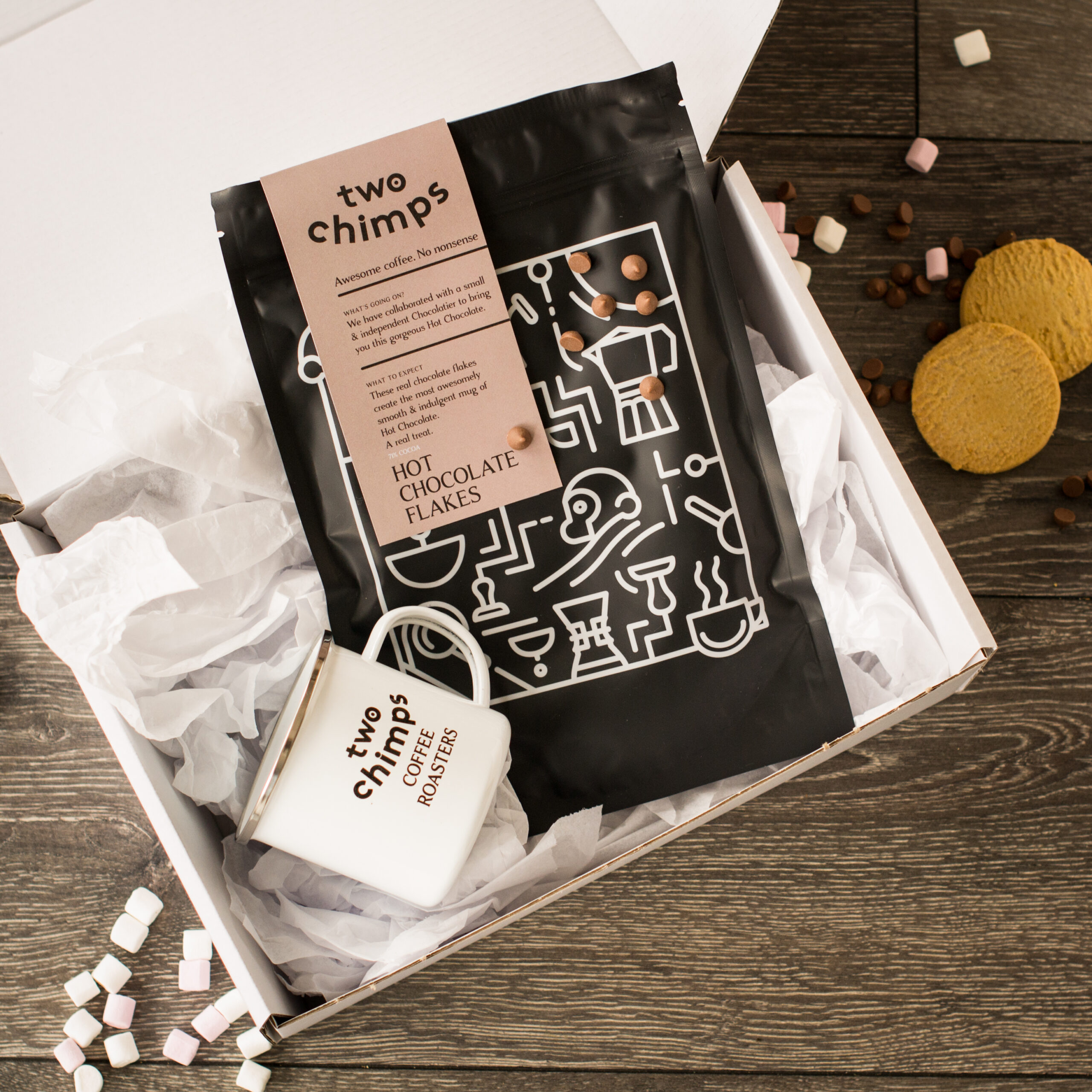 A step above the powdered stuff, these flakes are 71% real chocolate, creating an irresistible sweet cup. They can also be used to create the perfect mocha or as a baking ingredient! Once again, we have done all the hard work for you, as we do a hot chocolate gift set that includes our Two Chimps enamel mug, which can be sent straight to your gift receiver’s door.