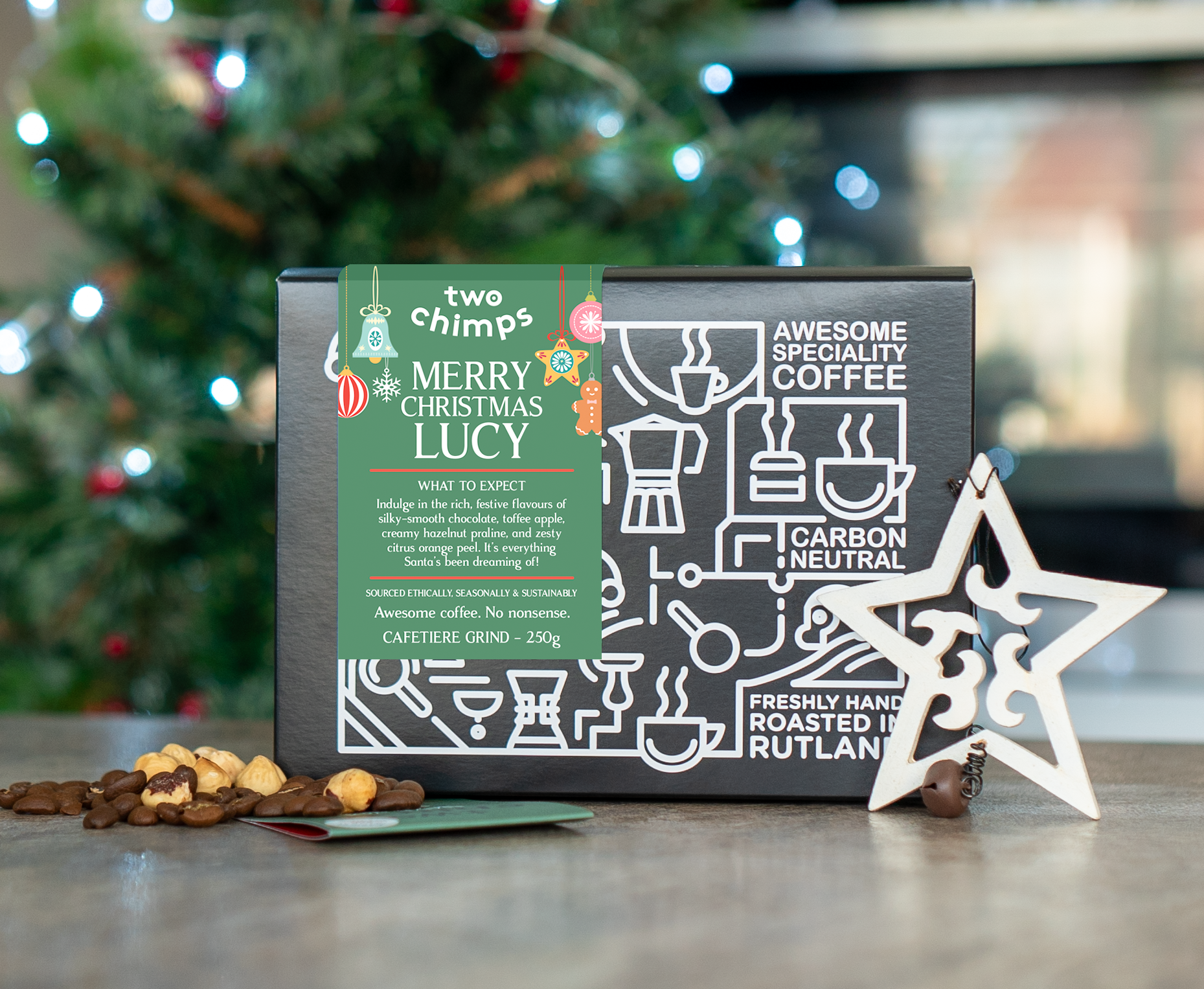 Each box allows up to 9 characters for customisation, and contain a 250g bag of our Christmas Coffee as whole bean or ground for cafetiere! Christmas = sorted.