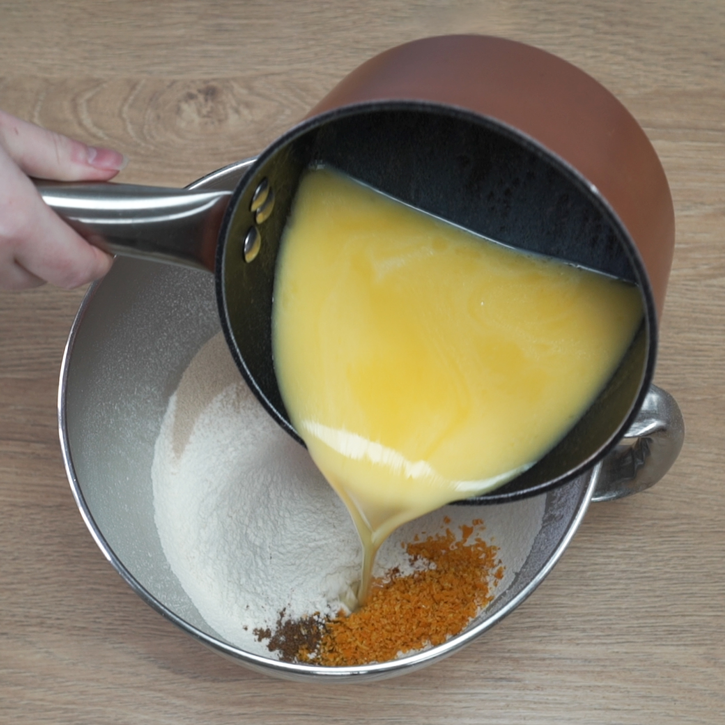 4. Next, add the yeast to one side of the bowl and the salt, mixed spice and orange zest to the other side.