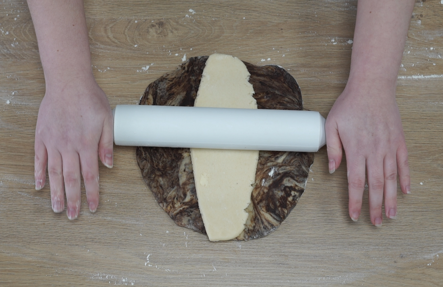 13. Roll out the marzipan into a 20cm long strip and lay it on top of the chocolate dough. Roll with a rolling pin to ensure they stick together.